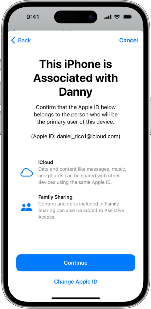 1. Check the Apple ID: Ensure the Apple ID displayed is the one that will be using Assistive Access.