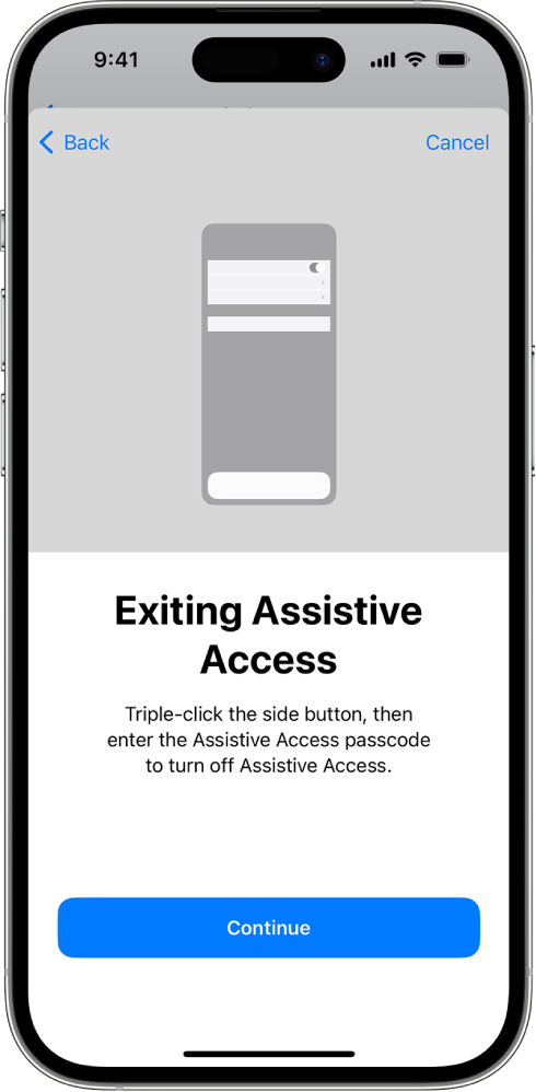 1. Exit Mode: Triple-click the side button (or Home button) and enter the Assistive Access passcode to exit at any time.